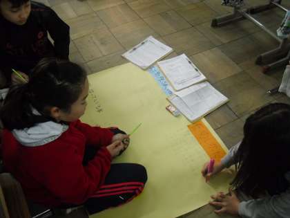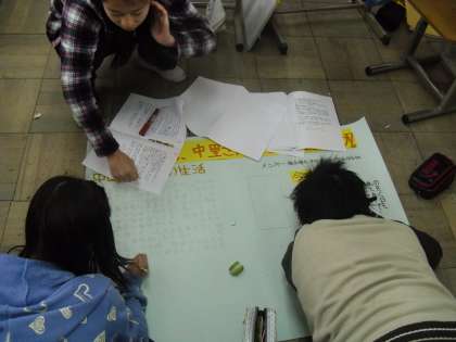 6年生は総合的な学習の時間に「中国帰国者から学ぼう」というテーマで,グループに分かれてそれぞれのテーマを決めて調べ学習をしてきました。今日は,調べたことを新聞にまとめたり,タブレットパソコンを使ってプレゼンを作ったりしていました。