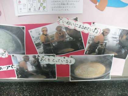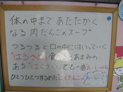 冬においしい食べ物「白菜」は,霜にあたるとやわらかくなり,甘味もまして,さらにおいしくなります。煮もの,炒め物,スープ,なべ物など,いろいろな料理に使います。風邪を予防するビタミンCを多く含んでいます。今日の「肉団子のスープ」にたっぷり入っていました。