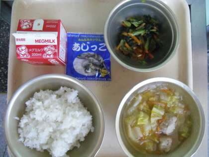 今日の給食は,「肉団子のスープ」「小松菜のオイルソース炒め」「じゃこ」「ごはん」「牛乳」でした。