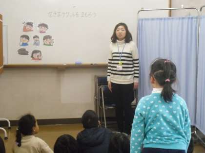 2年生の身体計測の前には,養護教諭の中澤先生から「せきエチケットをまもろう」という指導をしてもらいました。咳をすると3メートルくらい先までウィルスや菌が飛ぶことを学び,マスクをしたり手で口を押さえることの大切さを学びました。