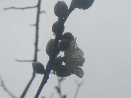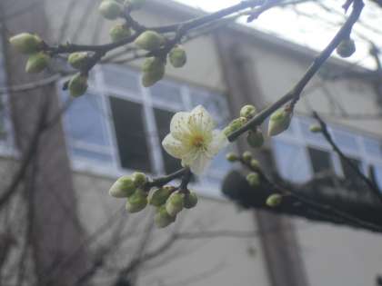 中庭の白梅が開花しているのを見つけました。一つだけかと思っていましたがよく見ると,4つも花が咲いていました。紅梅はまだ咲いてはいませんが,確実に一歩ずつ春が近づいています。
