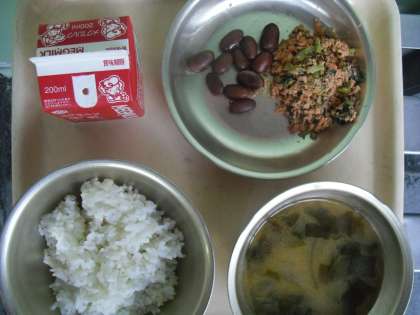 今日の給食は,「みそしる」「金時豆の甘煮」「さけとだいこん葉のまぜごはんの具」「むぎごはん」「「牛乳」でした。