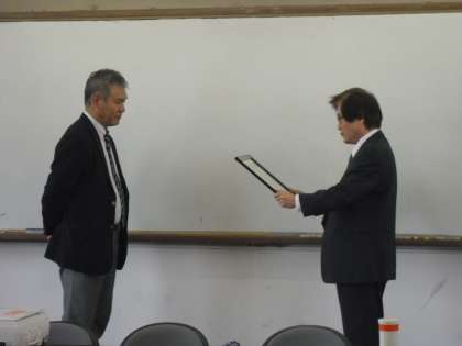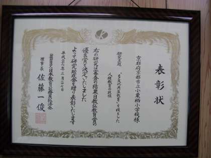 3月27日に東京で授賞式がありましたが,校務の都合で参加できなかったため,日教弘京都支部支部長様が代理で受け取っていただき,本日の職員会議の始めに校内で授賞式をしていただきました。大変立派な賞状と目録をいただきました。賞金につきましては,子どもたちの教育活動に還元できるものに使いたいと考えています。