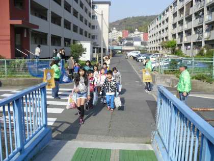今日から新しい町班長さんのもと,集団登校が始まりました。1年生もお兄さん,お姉さんに手をつないでもらって元気よく登校しました。あいさつも上級生を見習ってしっかりと大きな声でできていました。