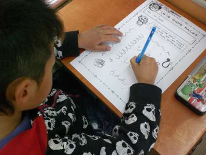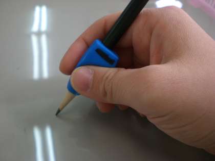 今日はえんぴつの持ち方について学習しました。正しくえんぴつを持つことができるよう,えんぴつに「もちかたくん」を付けて,指の位置の確認をしました。