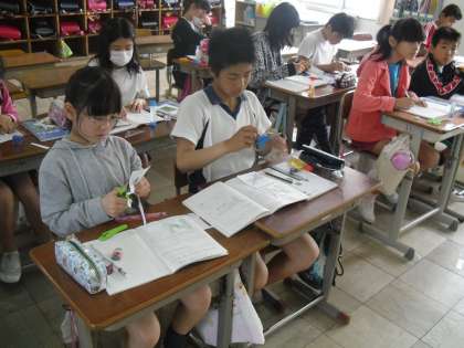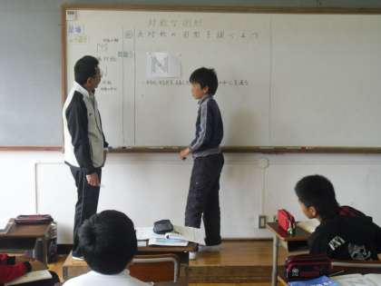 6年生は算数で「対称な図形」の学習をしています。今日は,点対称の図形の性質を調べました。「ぐんぐんクラス」も「のびのびクラス」も実際に図形を切り取って回転させて調べたり,わかったことを前に出て説明したり,みんながんばって問題に向かっていました。