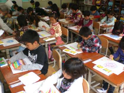 今日は,好きな色のクレパスを使って,おひさまの絵を描きました。にこにこ笑顔のかわいらしい34個の太陽の出来上がりです。