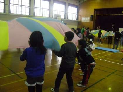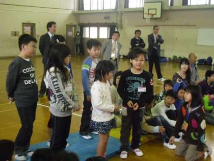 池田東小学校の体育館に56名の支部育成学級のお友達が集まって,「春のふれんどタイム」が行われました。