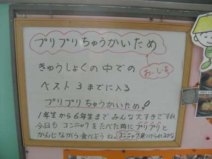 プリプリ中華炒めは,給食の中でベスト3までに入る人気メニューです。1年生から6年生までみんな大好きです。今日もこんにゃくを食べたときに「プリプリ」を感じながら食べようね。