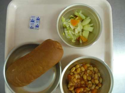 今日の給食は,「ポークビーンズ」「野菜のホットマリネ」「角チーズ」「黒糖コッペパン」でした。