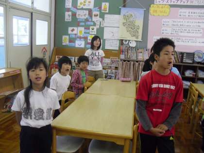 明日5月9日に行われる「1年生を迎える会」に向けて,ポプラグループ(たてわりグループ)に分かれてチャレンジタイム(中間休みの後の10分間)に歌の練習をしました。歌は「世界中の子ども達が」です。みんなで元気いっぱい歌えるように練習しました。