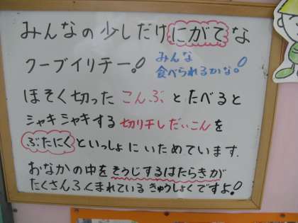 今日の給食は,沖縄の料理です。「チャンプル」とは,いろいろなものを「まぜる」という意味です。「クーブイリナー」の「クーブ」は「こんぶ」で,「イリチー」は,「いため煮」という意味です。味わって食べましょう。