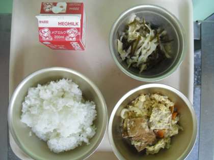 今日の給食は,「あつあげのチャンプル」「クーブイリチー」「ごはん」「牛乳」でした。
