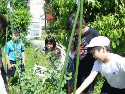 スナップエンドウが育ってきました!!なぜ花は咲くのか・・・というよい質問がでました。実際に花や実を見にいき学習しました。