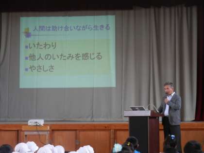 5/12(月)の朝会は,憲法月間に関わって「人権朝会」が行われました。校長先生から,小説家の司馬遼太郎さんの「二十一世紀に生きる君たちへ」という文章をもとに,「いたわりの気持ち」「自分に厳しく,相手にはやさしく」といった人として生きていく上で欠かせない心についての話をしてもらいました。