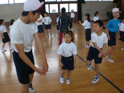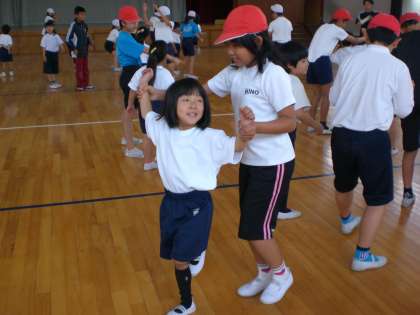 1年生の手を取り,一緒に動いてあげながら優しく教えている姿に,高学年としての頼もしさを感じました。