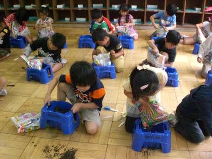 生活科の学習であさがおを育てていきます。今日はあさがおの種の観察をした後,実際に種を植木鉢にまきました。