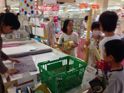 買ったたくさんある生地の中からお気に入りのものを選んで,紐と合わせて予算内に収まるように計算して買いました。