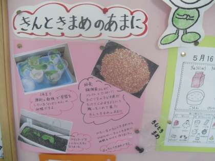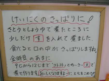 「金時豆の甘煮」は,三温糖と醤油でコトコトじっくり煮ました。いんげん豆の仲間である金時豆は,煮豆のほかに洋風煮込み料理にもよく使われます。ほんのり甘みのある金時豆を味わいましょう。