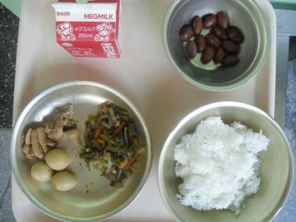 今日の給食は,「鶏肉のさっぱり煮」「野菜のきんぴら」「金時豆の甘煮」「ごはん」「牛乳」でした。