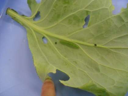 3年生は学年合同で理科の学習をしています。今日は,理科室で「もんしろちょうの幼虫」の観察をしました。キャベツの葉にいる幼虫を観察して,色や形,大きさ,動き,葉を食べた後の様子など特徴をノートに記録しました。