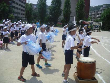 午後の部がスタートし,最初は「応援合戦」でした。応援団を中心に各色が全員で応援をします。今までの練習の成果がしっかりと出て,応援団のリードで整然と応援ができていました。