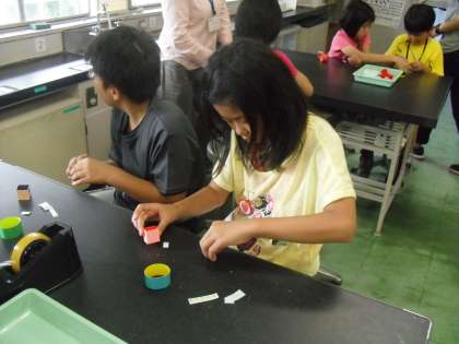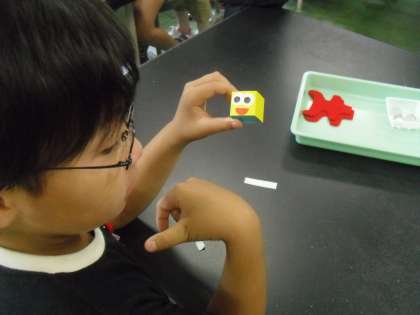 最後の実験学習では,「コロコロ人形」を作りました。ビー玉をおもりにして,坂をころころ転がる人形を作りました。科学センターの先生に作り方を教えてもらって,一人ひとりが自分で作りました。できた「コロコロ人形」を大きな坂から転がして遊びました。とても楽しい学習でした。