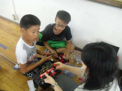 4年生は理科の学習で「電池のはたらき」の学習をしています。今日は,モーターカーを作って,電池を並列つなぎにしたときと,直列つなぎにしたときとで,どちらが速いかを調べました。