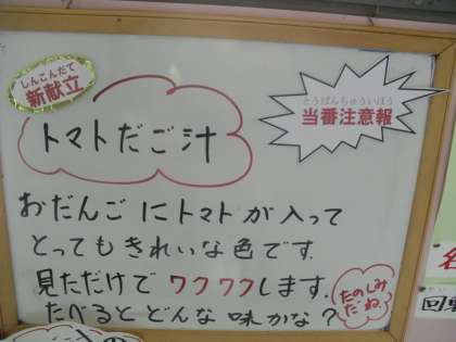 「だご汁」は,九州地方でよく食べられています。どご汁の「どご」とは,だんごのことです。給食では,トマトを使って作りました。つぶしたトマトと水で小麦粉と片栗粉をよく練り,だし汁の中にスプーンでだんごを落として作りました。