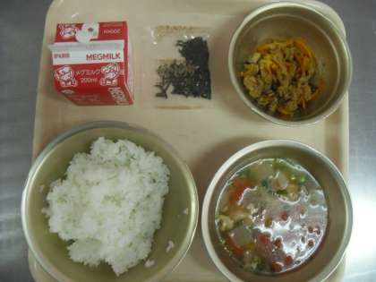 今日の給食は,「トマトだご汁」「ツナそぼろどんぶりの具」「刻みのり」「ごはん」「牛乳」でした。