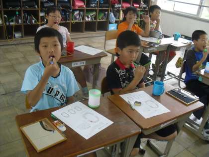 6/9には,1,2年生は歯科衛生士さんによる歯磨き指導を行いました。3年生以上は,「カラーテスター」を使って歯の汚れを調べ,正しい歯の磨き方の練習を養護教諭の中澤先生に指導してもらいます。