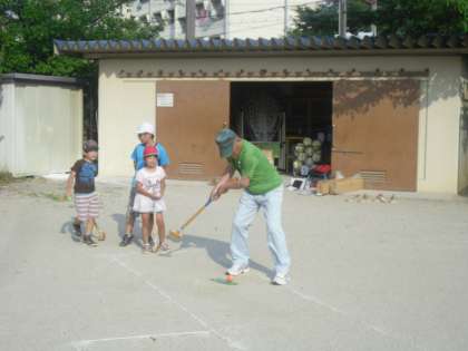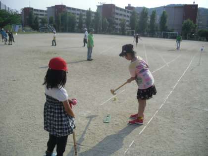 部活動の「グランドゴルフ」部は,毎週月曜日の放課後に活動しています。地域の指導者の方々に教えてもらって,とてもうまくなってきました。3回で入れられるように暑い中,がんばって練習していました。