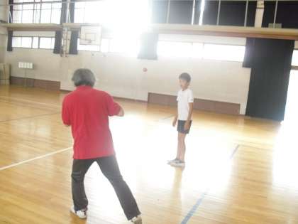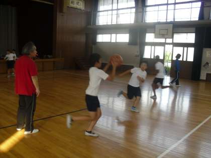 部活動のバスケットボール部は,月曜日の放課後に毎週練習をしています。今日は,地域指導者の北村先生にパスの出し方を教えてもらいました,二人組で速く落とさずにボールを運ぶ練習をしました。