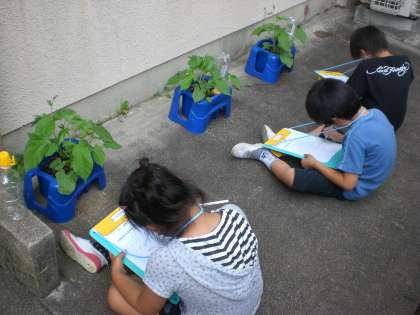 あさがおの成長の様子を観察しました。ぐんぐん育っています。