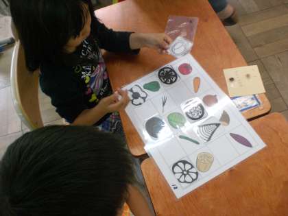 今日は,栄養教諭の早光先生が,野菜のおなかの中(断面図)に関する楽しいクイズを出してくれました。カードを使って,楽しく学習することができました。