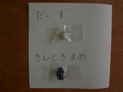 また,「豆のおへそ探し」も実際の豆を使ってやってみました。1人1人に2種類の豆を配り,じっくりと観察することができました。