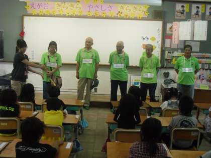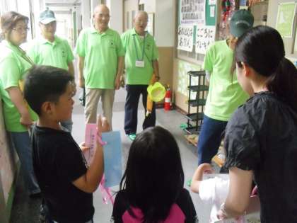 いつも登下校の安全でお世話になっている「見守り隊」の方々と1年生との交流会を行いました。見守り隊の方々が朝の見守り活動を終えられた後,学校に来てくださいました。1年生の代表の児童が校長室までお迎えにきてくれて,見守り隊の方々に名札をつけてくれ,教室まで案内してくれました。