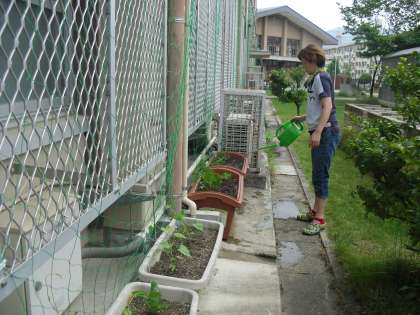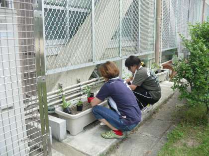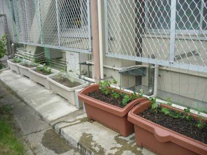 事務職員さんと管理用務員さんが丁寧に植え付けてくれた グリーンカーテンのための苗。