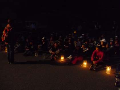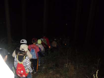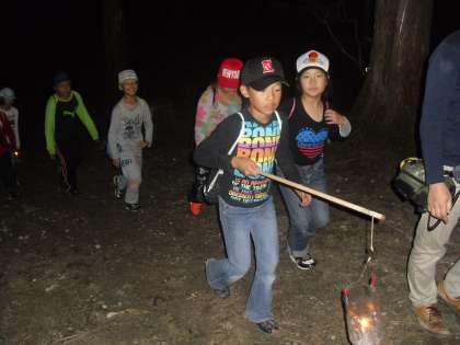 辺りが薄暗くなてきたので、いよいよ「ナイトハイク」に出かけました。班長さんだけがランタンを持って、後ろに続きます。山道を登ったり下ったりのコースで、暗い中みんなで励ましあって宿泊棟まで戻りました。