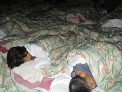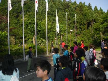 昨夜は、10時過ぎにはみんな眠りにつきました。朝6時までぐっすりと寝ていました。朝は、7時から「朝のつどい」がありました。山の家で活動している4校が合同で行いました。それぞれ代表の児童が「学校紹介」を行いました。本校の代表の児童はすばらしい小栗栖小学校の紹介をしてくれました。