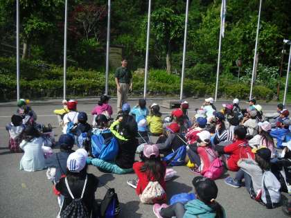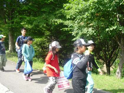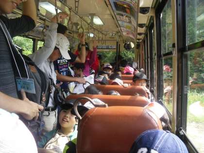 山の家の先生から説明を聞いて、「交流の森」に向かって出発しました。行き帰りは1台のバスに乗りましたが5年生が4年生に席を譲り、4年生がお礼を言うなど、とてもいい姿が見られました。