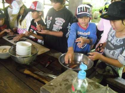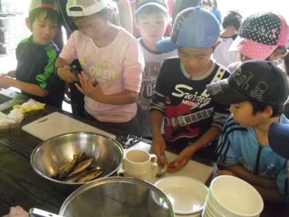 「魚つかみ」で捕まえたイワナを、山の家の先生に教えてもらってさばきました。料理ばさみでおなかを切って、はらわたを取り出した後、串刺しにします。はじめはドキドキしていましたが、みんなしっかりとさばくことができました。