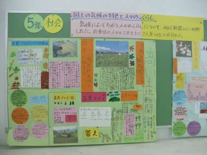階段の踊り場にある5年生の掲示板には,社会科で学習した,「気候によってちがう人々のくらし」についての新聞が掲示されています。子ども達はこの学習で人々の衣食住の工夫をたくさん見つけることができました。