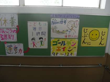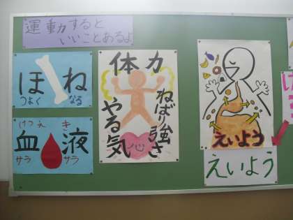 「おぐりすタイム」の発表「うんどうのひみつ」で使った絵カードを掲示板に貼りました。この絵カードでとてもよく運動のことがわかりました。