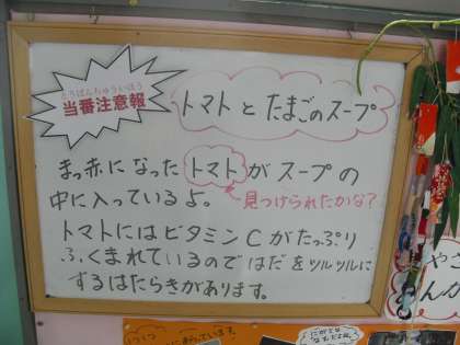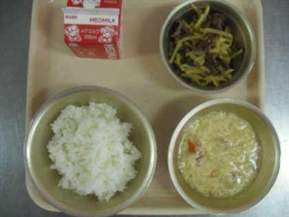 今日の給食は,「トマトと卵のスープ」「牛肉とジャガイモの炒めもの」「ごはん」「牛乳」でした。