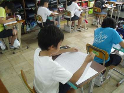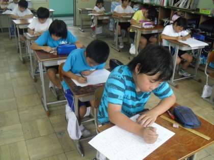 今日は,「第1回 校内漢字検定」を2年生以上の全学級で行いました。「校内漢字検定」は,7月,12月,3月の3回(1年生は12月から)行います。100問の問題があり,90点以上が合格となります。国語の授業だけでなく,宿題や帯時間の幹事チャレンジなどで練習をしてきた力を試すことで漢字の定着を図っています。