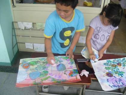 2年生が図工で取り組んできた「あじさいとかたつむり」の絵が,だんだんと完成してきました。今日は,仕上げをがんばっていました。