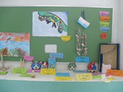 北校舎東階段の踊り場に,5年生が夏休みの自由研究で作った作品が展示されています。一人一人の児童が,自分のアイデアで粘り強く作り上げた作品です。