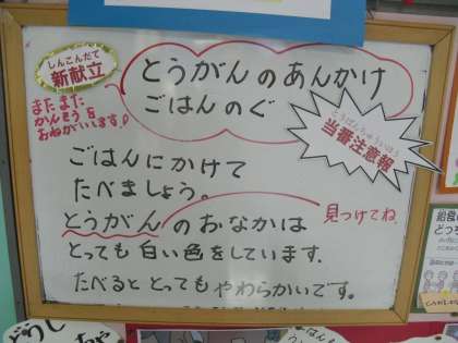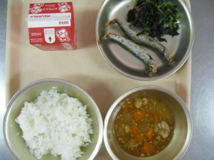 今日の給食は,「ししゃもの唐揚げ」「ほうれん草のおかか煮」「冬瓜のあんかけご飯の具」「ごはん」「牛乳」でした。