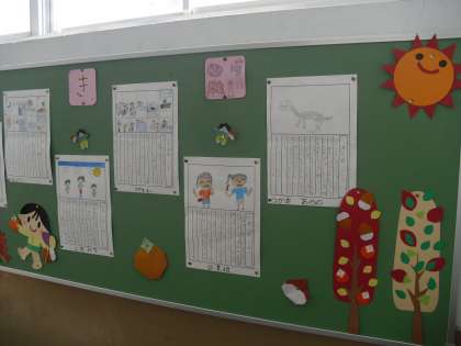 南校舎階段の踊り場の3年生の掲示板に夏休みの絵日記が掲示されています。家族で旅行に行ったこと,海やプールで泳いだこと,水族館や夏祭りに行ったことなど,夏休みの思い出が掲示されています。